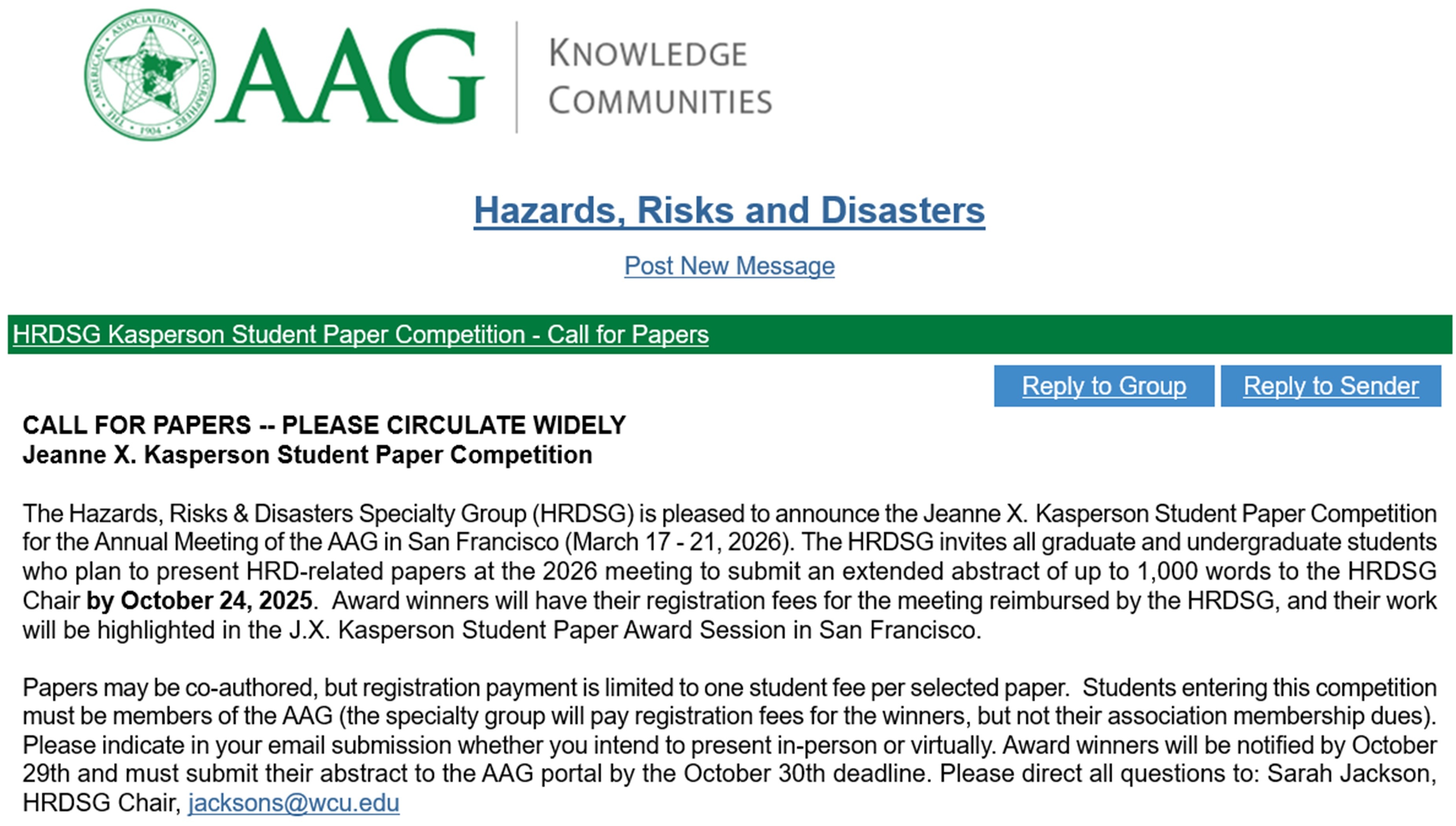 Lab member Liyue Zhang wins the Jeanne X. Kasperson Award, which is a student paper competition award, from the AAG Hazards, Risks and Disasters Specialty Group (HRDSG). Liyue will receive a registration reimbursement for the 2026 AAG Annual Meeting in San Francisco, California, where she will present her paper in a special award session. The mission of the AAG HRDSG is to promote research, education, and the application of knowledge about natural, technological, and social hazards; to strengthen communication and collaborative activities among geographers pertaining to hazards; to encourage communication between geographers and the members of other disciplines and professions that share an interest in hazards. Congrats, Liyue!